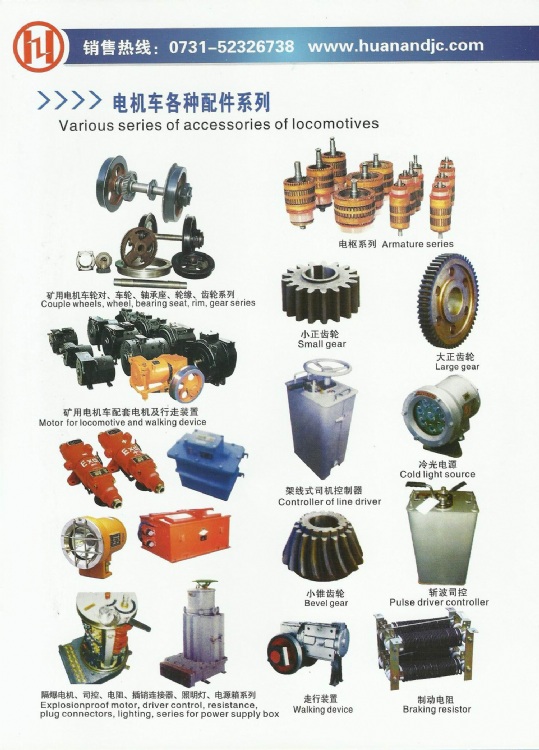 locomotive wheel,bearing seat,rim,small gear,large gear,armature series,walking device,trolley controller,cold light source,bevel gear,chopped wave controller,braking resistance,explosion proof motor,plug connectors,light,power supply box etc.