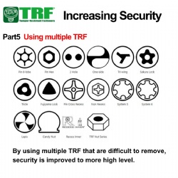防盜螺絲TRF®,除非使用防盜螺絲專用工具,否則安裝和拆卸都會比較困難。螺絲頭部形狀有14種,,螺帽有3種形狀可以選擇在庫尺寸一個起售尺寸:M2∼M12(螺帽到M16),並且有英制尺寸